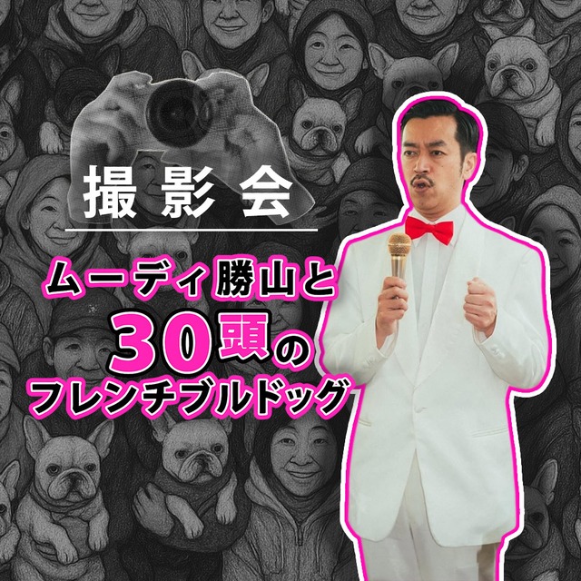 ムーディ勝山さんを30頭のフレンチブルドッグで囲う、前代未聞の撮影会を開催します! カメラマンは、シュールな写真でおなじみの大竹宏明さん。 みんなで撮影した「集合写真」は、ムーディ勝山さんのSNSにも掲載されちゃいます! 力を合わせて見たことのない光景を作り、世間を驚かせちゃいましょう(笑)。 ※集合写真のほか、ムーディ勝山さんとご家族のファミリーショットも「2カット(寄り/引き)」撮影いたします! 一生笑える家族写真を撮影しましょう♡ 【詳細はこちら】 ◆撮影日時 2025年12月7日(日) 11:00~15:00 ※先に集合写真を撮影し、その後順次ご家族写真を撮影させて頂きます。 ◆撮影場所 神奈川県某所(予定) ※参加者様のみ、個別で撮影場所をご連絡差し上げます ◆撮影時間 集合写真:30分 家族写真:1組様 約5分 ◆定 員 30組様 ◆料 金 ¥15,000 (税込) ◆カット数 ・[集合写真]ムーディ勝山と30頭のフレンチブルドッグ ・ムーディ勝山×ご家族(2カット ※寄り/引き) ※合計3カット ◆特典 ・集合写真をムーディ勝山さんのSNSに掲載! ・ザリアル newステッカープレゼント! ※当日お渡しいたします 【撮影会に参加される皆さまへ】 ・参加される方には、後日編集部より個別にご案内メールをお送りいたします。 ・集合写真はご家族のみなさまもご一緒に撮影いたします。 ムーディ勝山さんのSNSおよび、フレブルザリアル(SNS含む)にて公開させて頂きます。 ・悪天候等、主催判断での中止以外のキャンセルは出来かねます。 ご了承くださいませ。 ・服装は自由となります。 カジュアル、ドレス、コスプレなど自由な衣装でお越しくださいませ。